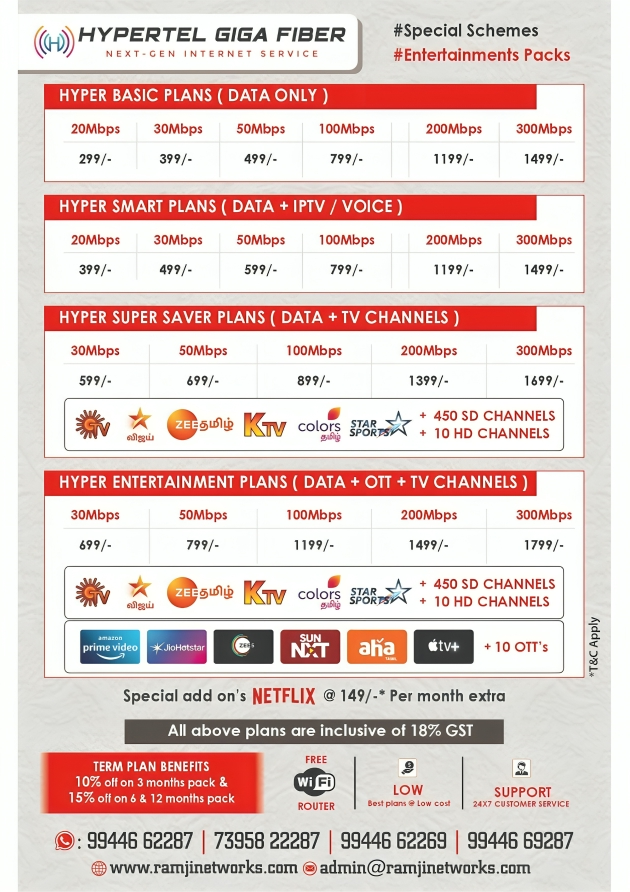 Enjoy a variety of options, from high-speed internet to entertainment-packed TV channels and popular OTT subscriptions — all at prices that are hard to beat. powered By Peercast telecom India PVT LTM